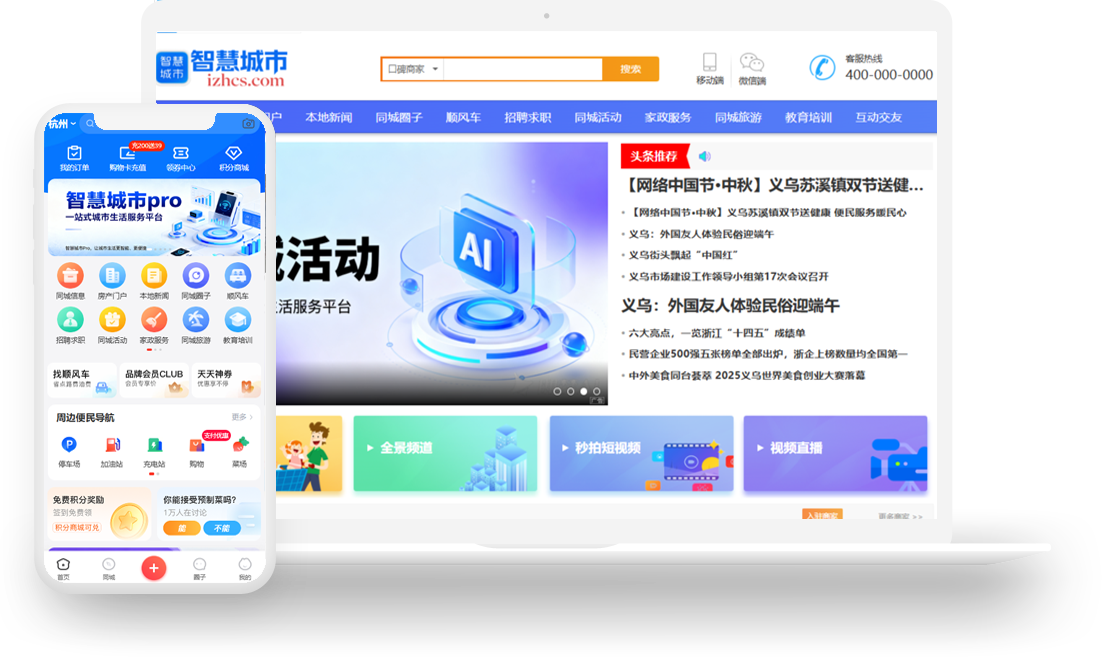 示,多端口全覆盖综合生活门户体系,数据无缝展示,为用户提供一站式地方门户系统