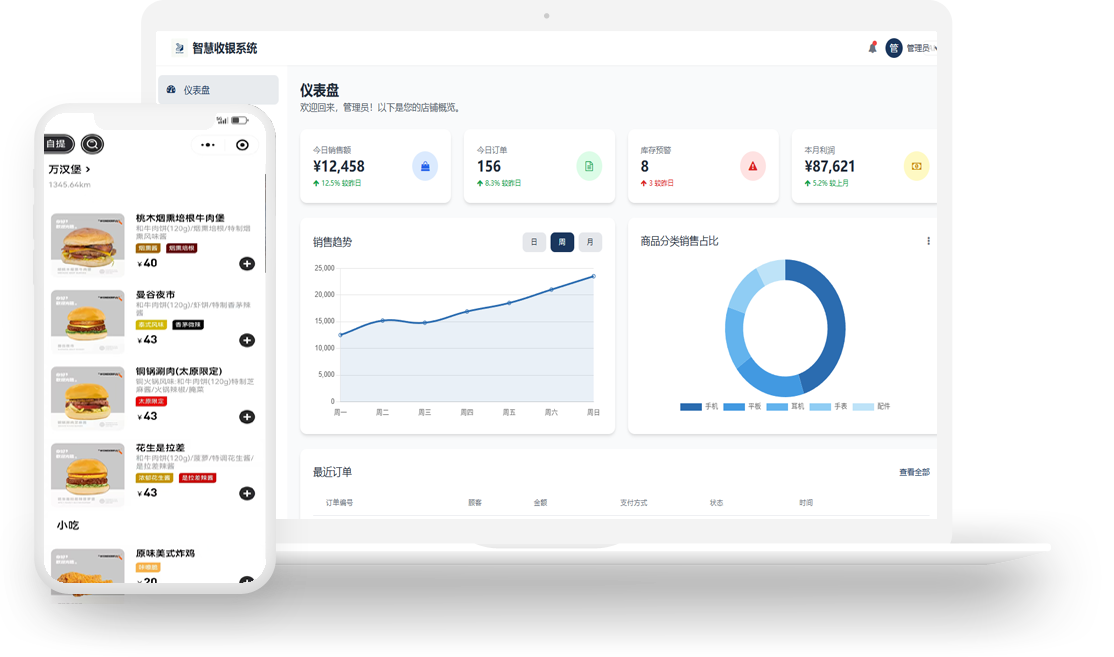 PC端收银、小程序点单、APP移动管理,数据实时同步,随时随地掌控经营状况。